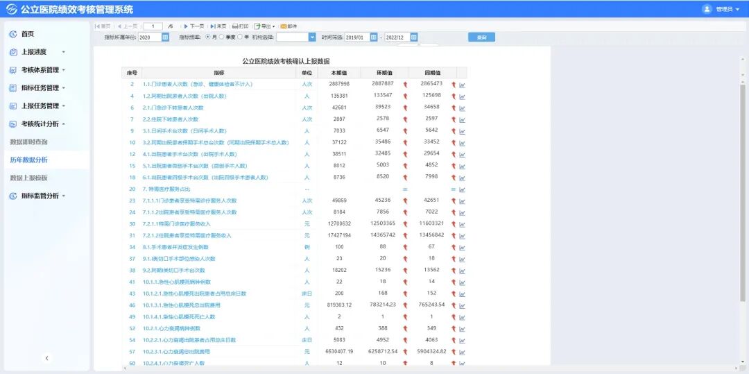 在统计分析中,按照月度/年度数据考核,充分运用历史考核结果,可横向分析历史考核数据,分析历史指标数据的变化规律,一目了然了解到指标的质量情况,快速查找需要优化的指标,助力提高“国考”排名,推动医院有效科学的管理,改善医疗服务质量,提升医疗服务水平。