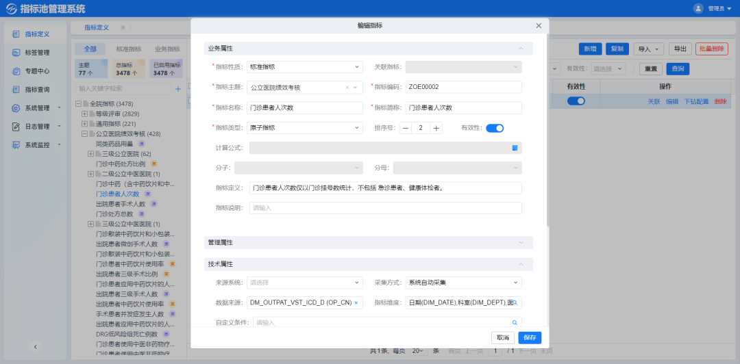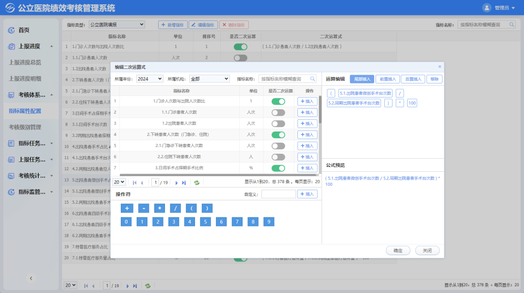 系统上还可对指标的属性和运算规则进行配置管理,以适应变化的考核标准,当国家指标算法变更,只需要进行规则配置,结果就会自动变化。在填报过程中,所有的计算指标也会随着关联指标自动计算。