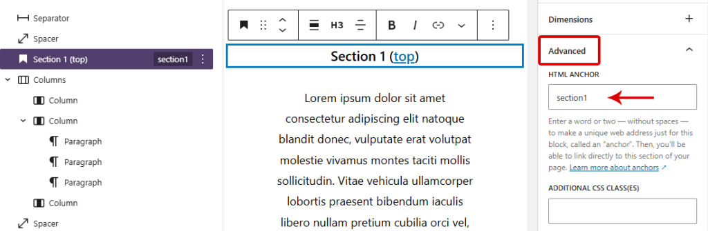 Select any block and give it a unique Anchor ID in the Advanced tab to create the target point.